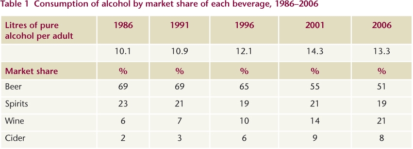 Beer still has the largest market share of any alcoholic beverage, although its consumption is decreasing and its market share fell from 69% in 1986 to 51% in 2006 (Table 1). Wine has shown the greatest increase in popularity in the past 20 years, from 6% to 21%, and now has a higher market share than spirits. The market share of cider has also increased, from 2% in 1986 to 8% in 2006