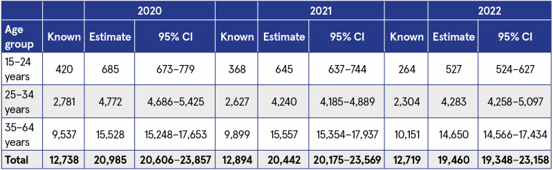 Table 2: Comparison of estimated number of problematic opioid users over time (2020–2022), by age group