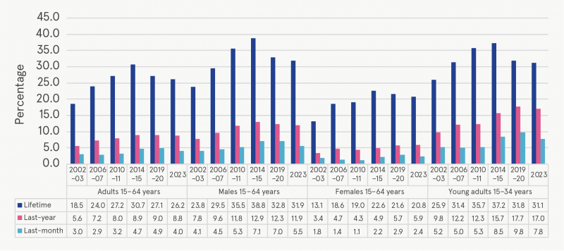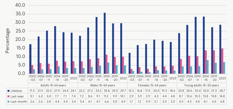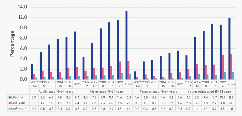 The prevalence of cannabis use was noticeably higher among young adults, with lifetime, last-year and last-month rates being higher than those recorded in 2019–20, at 28.7%, 14.8% and 6.8%, respectively.