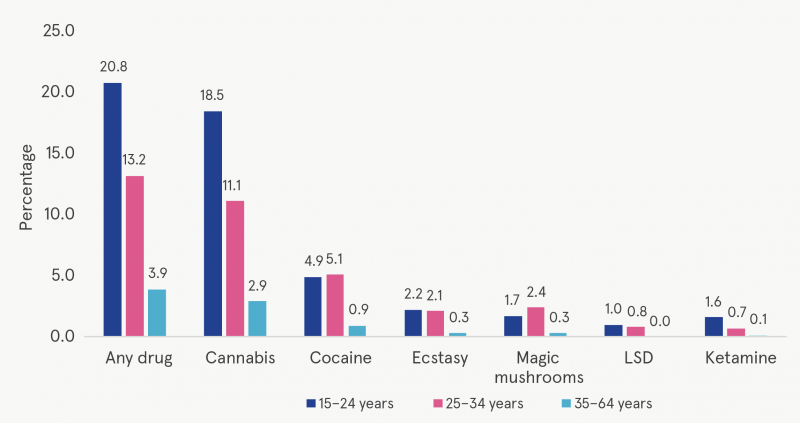 Overall, those aged 15–24 years were most likely to report any drug use and this was particularly the case for cannabis and ketamine (Figure 2). Magic mushrooms use was most common among 25–24-year-olds, while similar proportions of 15–24-year-olds and 25–34-year-olds reported cocaine use.