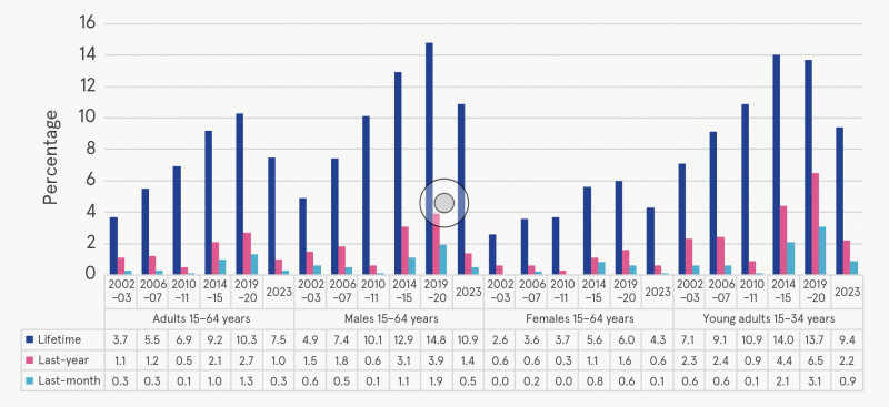 Notable decreases in ecstasy use were also observed among those aged 15–34 years. In 2023, 9.4% of young adults said they had tried ecstasy at least once in their lifetime (compared with 13.7% in 2019–20), 2.2% had tried it in the last year (compared with 6.5% in 2019–20) and less than 1.0% indicated current ecstasy use (compared with 3.1% in 2019–20).