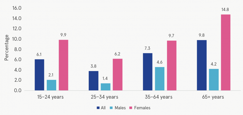 likely than males to report use (10.2% versus 3.7%). Those aged 65 years and older were more likely than younger age groups to report recent sedative/tranquilliser use (9.8%). Females aged 65 years and older had the highest prevalence of recent use (14.8%), while males aged 25–34 years had the lowest prevalence, at 1.4% (see Figure 6).