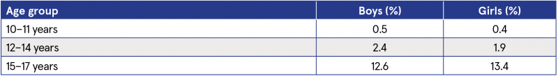 Table 1: Percentage of 10–17-year-olds reporting cannabis use in the last year, by sex and age group, 2022