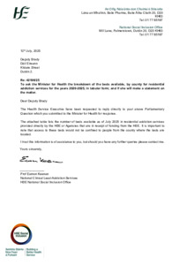 2814. Deputy John Brady asked the Minister for Health the breakdown of the beds available, by county, for residential addiction services for the years 2020 to 2025, in tabular form; and if she will make a statement on the matter. [42196/25]