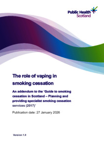 Public Health Scotland. (2026) The role of vaping in smoking cessation. An addendum to the ‘Guide to smoking cessation in Scotland – Planning and providing specialist smoking cessation services (2017)’. Edinburgh: Public Health Scotland.