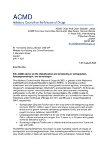 The Advisory Council on the Misuse of Drugs (ACMD) is grateful to the Medicines and Healthcare products Regulatory Agency (MHRA) for providing a written submission and oral presentation on three growth hormone agonists, somapacitan (Sogroya®), lonapegsomatropin (Skytrofa®), and somatrogon (Ngenla®). All three are designated as orphan medicinal products and have been granted a marketing authorisation in the UK. Further to these representations, the ACMD is able to provide advice regarding the appropriate classification and schedule for these three medicines under the Misuse of Drugs Act 1971 and Misuse of Drugs Regulations 2001, respectively.