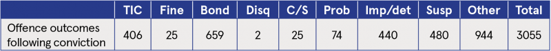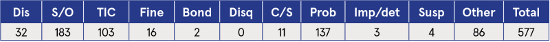 Note: Dis = dismiss; S/O = strike out; TIC = taken into consideration; Disq = disqualified; C/S = community service; Prob = probation; Imp/det = imprisonment or detention; Susp = suspended sentence