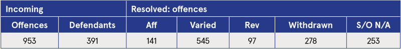 In 2024, 391 appeals from the District Court, representing 953 offences, were dealt with in the Circuit Court.1 Appeals and offences in 2024 were approximately 42% and 12% lower than in 2023, respectively (appeals = 677; offences = 1,078). Table 6 shows a breakdown of resolved offences.