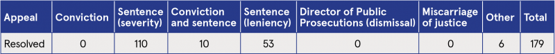 The number of appeals that were lodged from the Circuit Criminal Court for drug/misuse of drugs offences was nearly 46% lower in 2024 (n=97) when compared with 2023 (n=179).1 Overall, 179 appeals that originated in the Circuit Criminal Court were resolved in 2024.1 Table 7 indicates that most appeals resolved were for sentence severity (n=110), followed by sentence leniency (n=53), conviction and sentence (n=10), and other (n=6).1