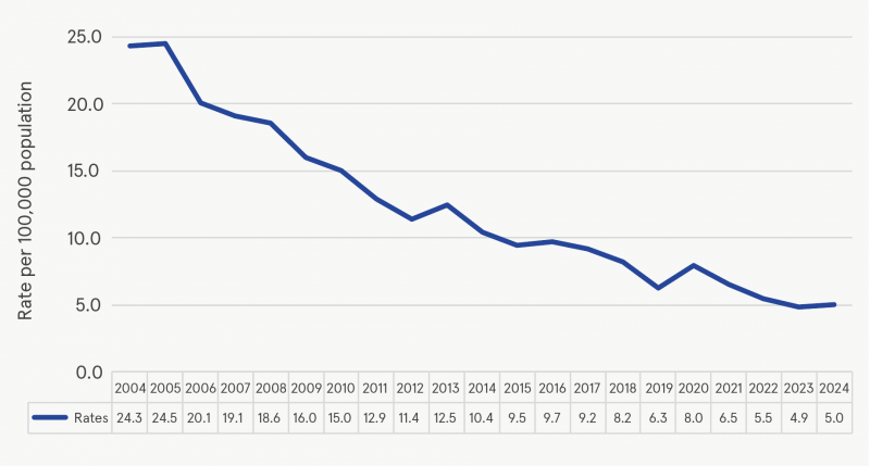 Figure 1: Rates of psychiatric first admission of cases with a diagnosis of an alcohol disorder per 100,000 of population in Ireland, 2004-2024