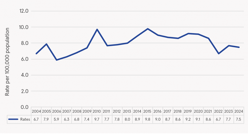 In 2024, some 860 cases were also admitted to psychiatric facilities with a drug disorder. Of these cases, 385 were treated for the first time. Figure 2 presents the rates of first admission between 2004 and 2024 for cases with a diagnosis of a drug disorder. The admission rate in 2024 (7.5 per 100,000 population) was similar to that reported in 2023 (7.7 per 100,000 population). It should be noted that the report does not present data on drug use and psychiatric comorbidity; it is therefore not possible to determine whether or not these admissions were appropriate.